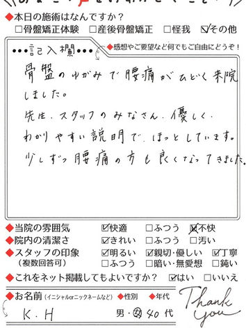 特に何かしたわけではなくがずっと腰が重い。ちょっと動きすぎると必ず疲れが腰に来る、もう何年もスッキリしないといったような慢性の腰痛。